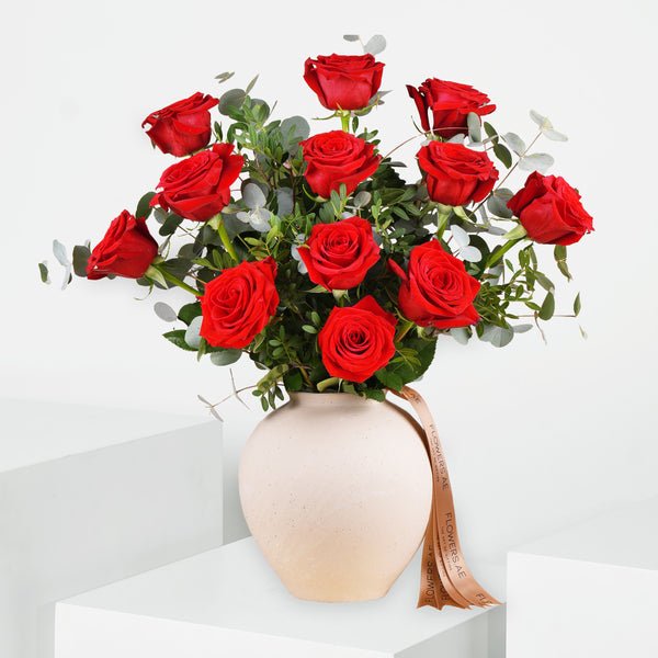 12 premium red roses in a vase.